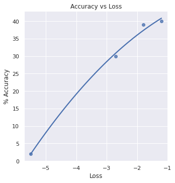 The accuracy vs. loss graph is shown below. Note that the losses have been converted to negative numbers to better reflect how as the neural network was trained more, loss got closer to 0 and accuracy increased.