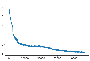 Shown below is a graph of the loss of our neural network over time. On the x-axis is the batch number. (Each batch corresponds with 64 images being used in training our neural network). On the y-axis is the loss of our neural network. You will notice that the loss flattens off in the approximate batch range [12000, 18000]. This corresponds to the issue we discussed earlier of decreasing our learning rate too much too soon.